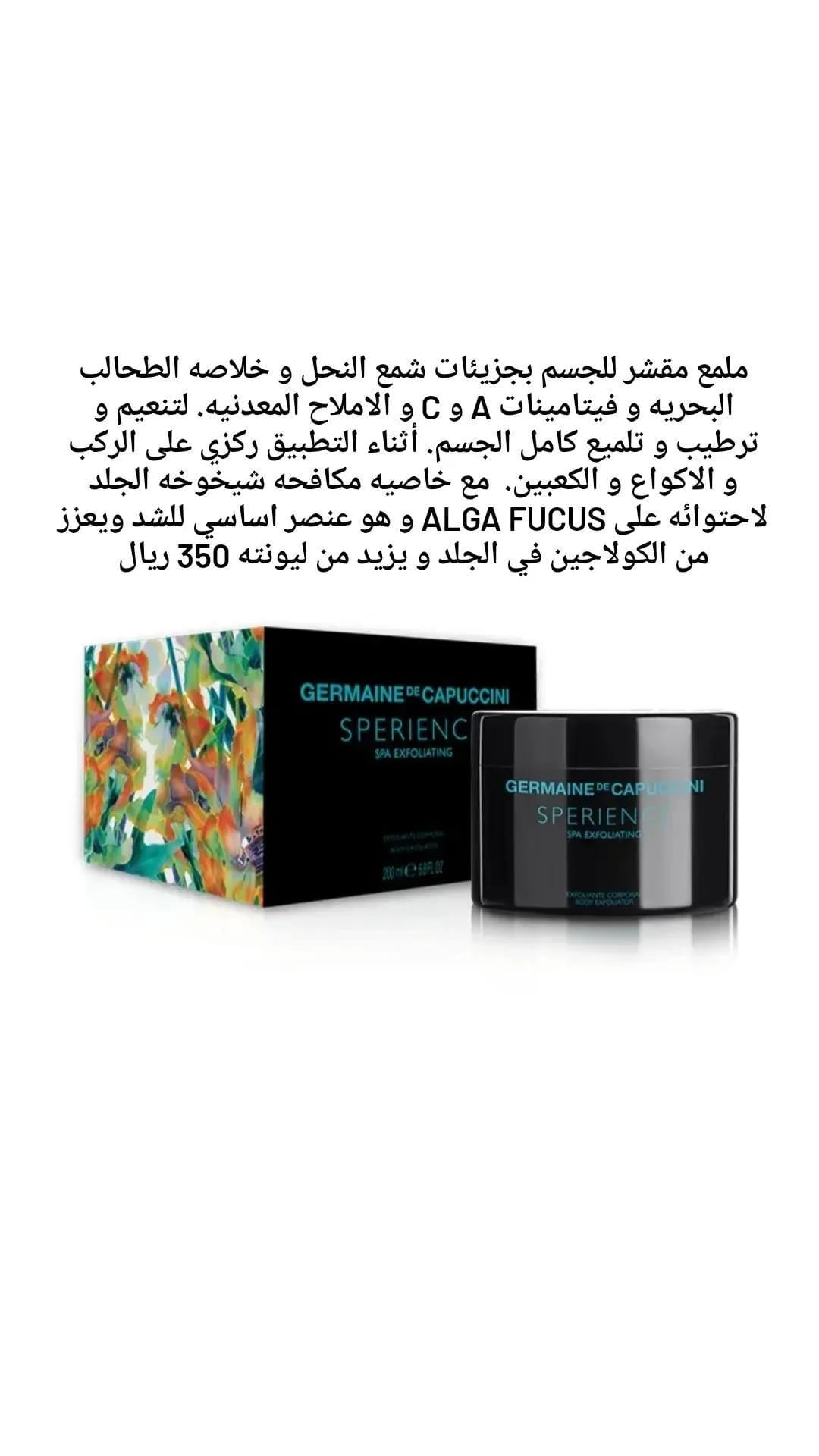 A marine inspired body scrub that leaves the skin totally nourished and softened. Rich in Brown Algae extract, mineral salts and Vitamin C and E, it helps to stimulate lipolysis, detoxify the skin and remove dead cells.