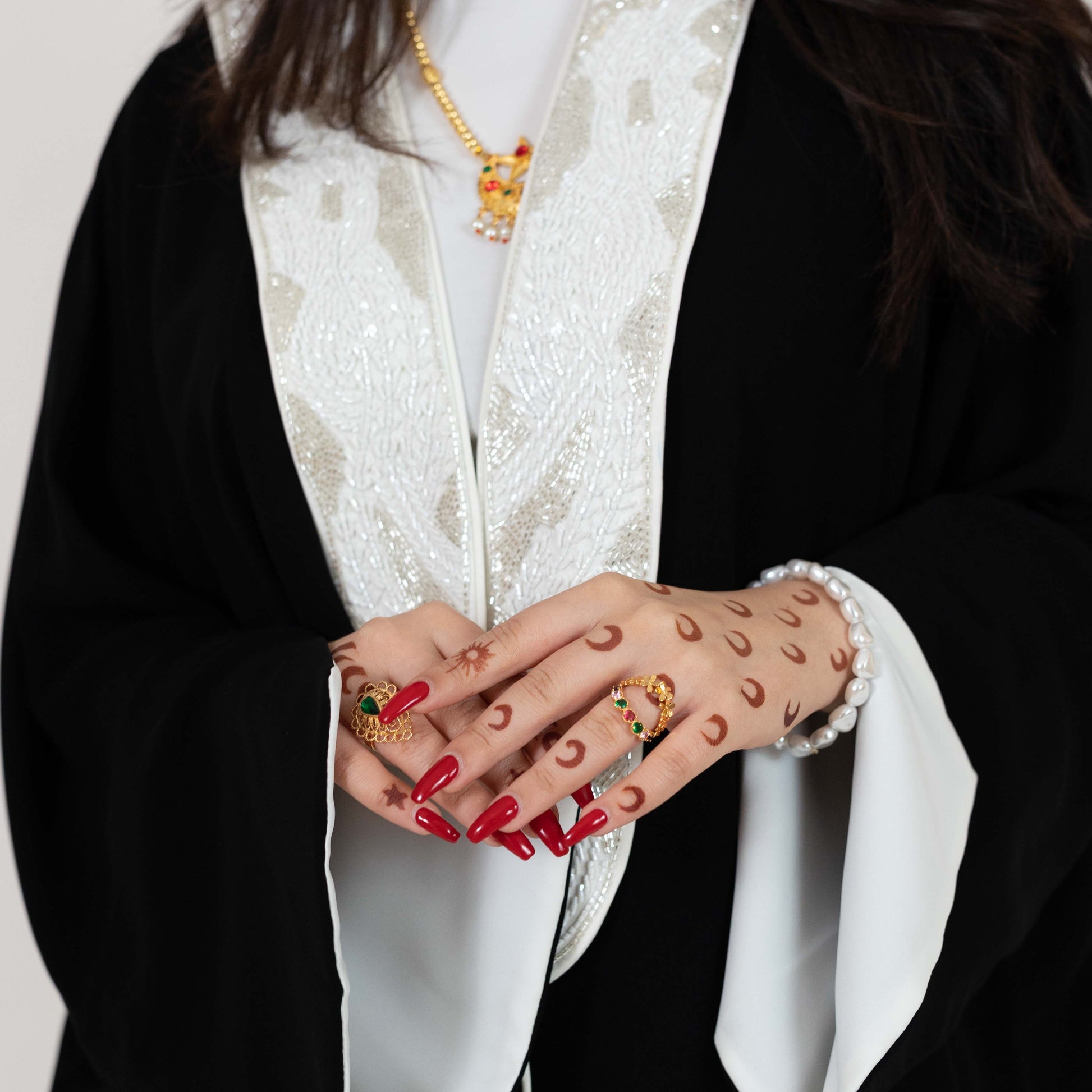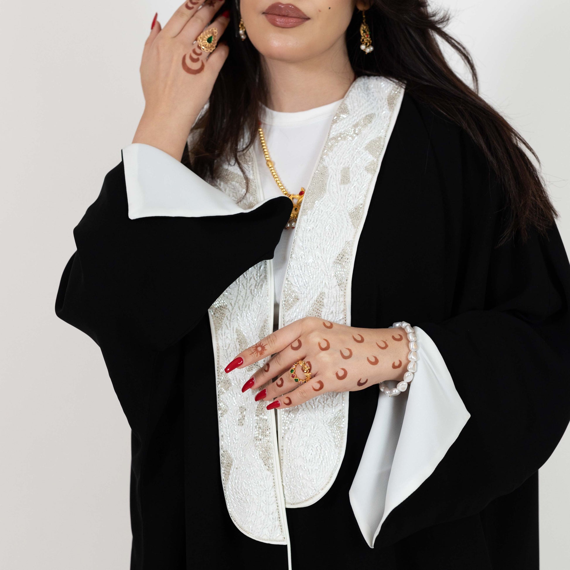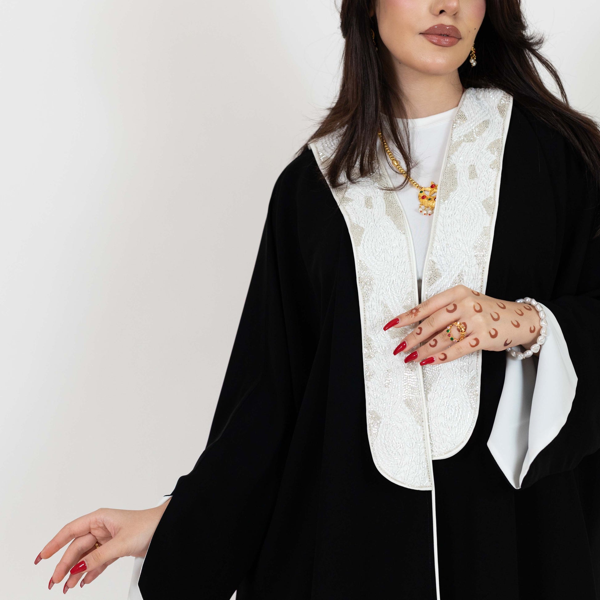 Make a stylish and elegant statement with the Black Abaya With White Embellishments On Top Front. Let the contrasting colors and intricate details showcase your sophisticated sense of fashion.