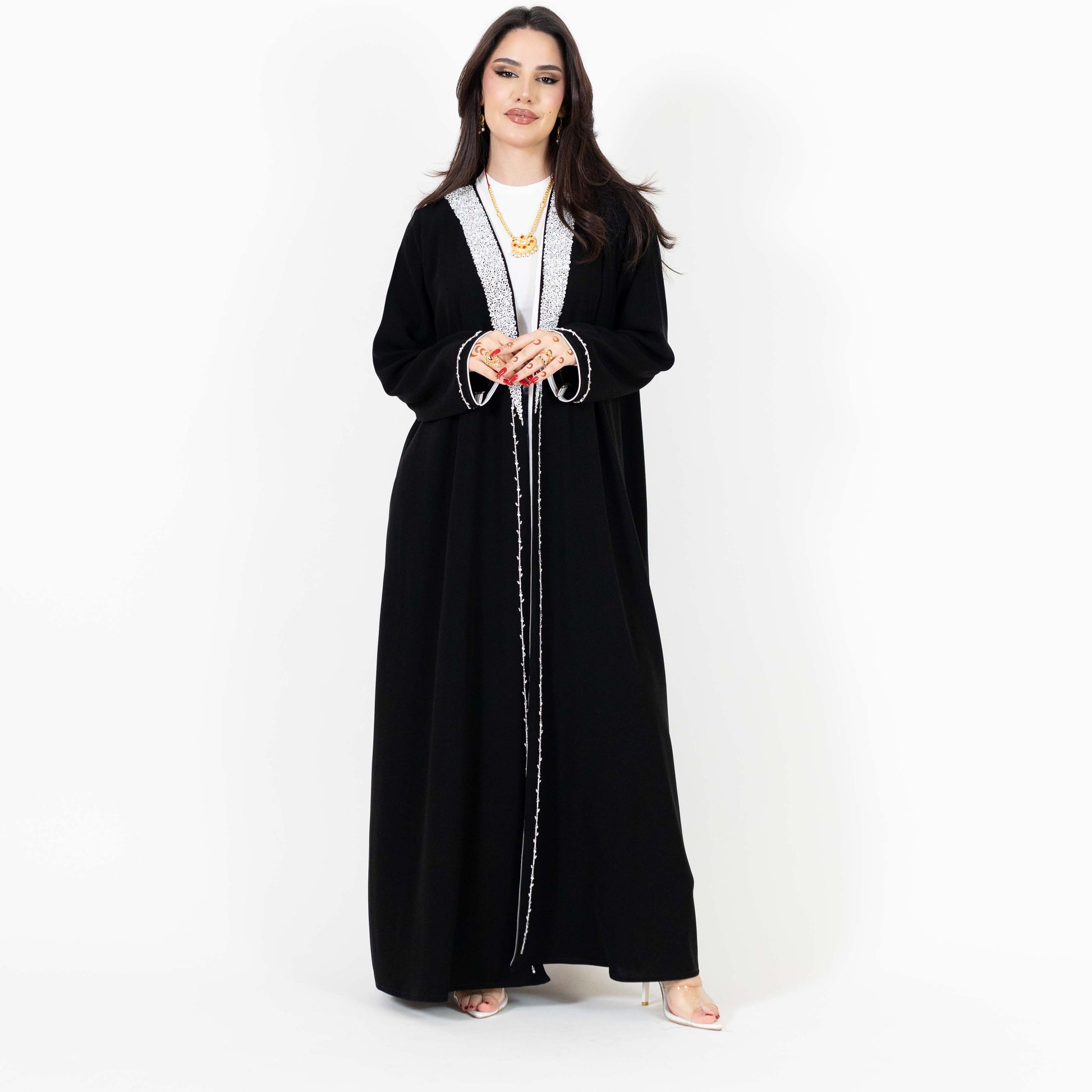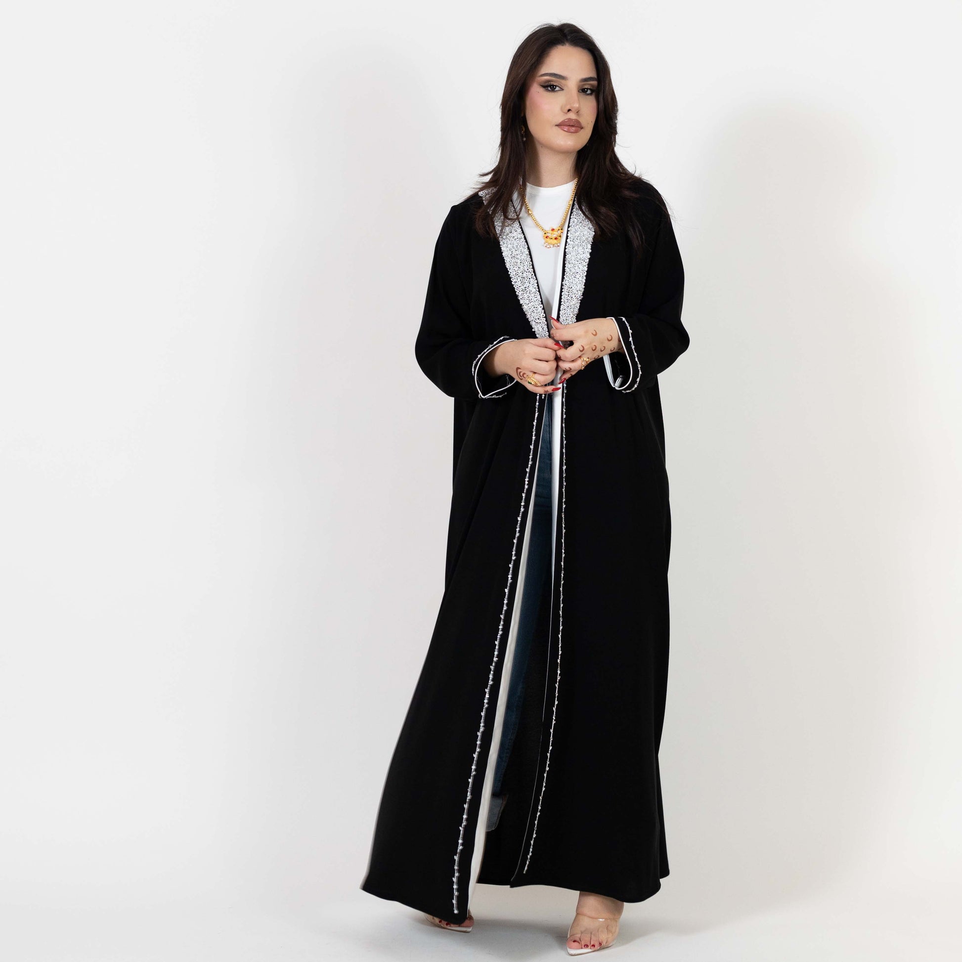 This black open abaya is a versatile piece that requires minimal styling. The white details along the plackets adds a touch of femininity to your outfit.