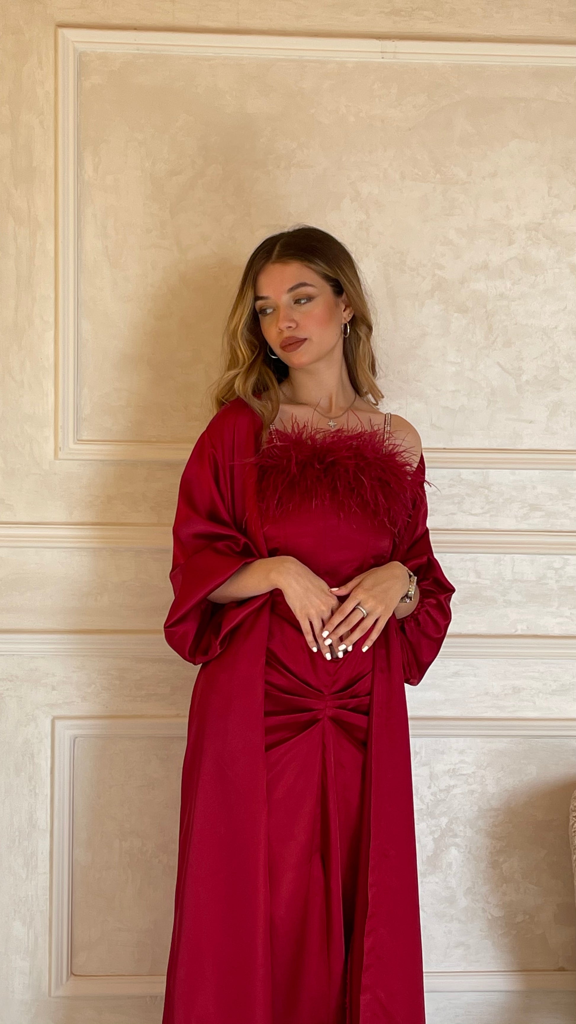 A feminine design from Butter Wear crafted with delicate satin bodice and a defined crepe texture, while the lowered hem gives the corset that classic style. this piece is decorated with feather embellishments all around the neckline and crystals along the shoulder strap.