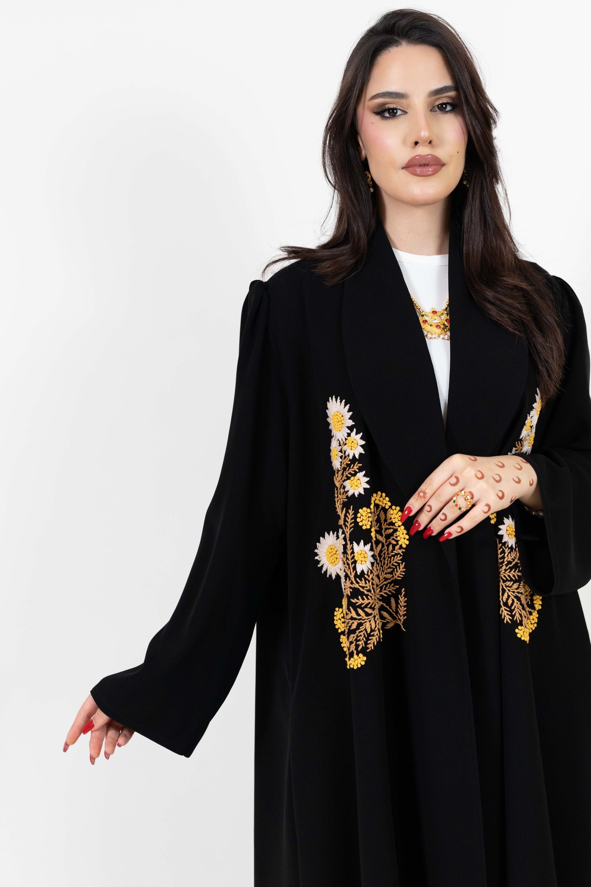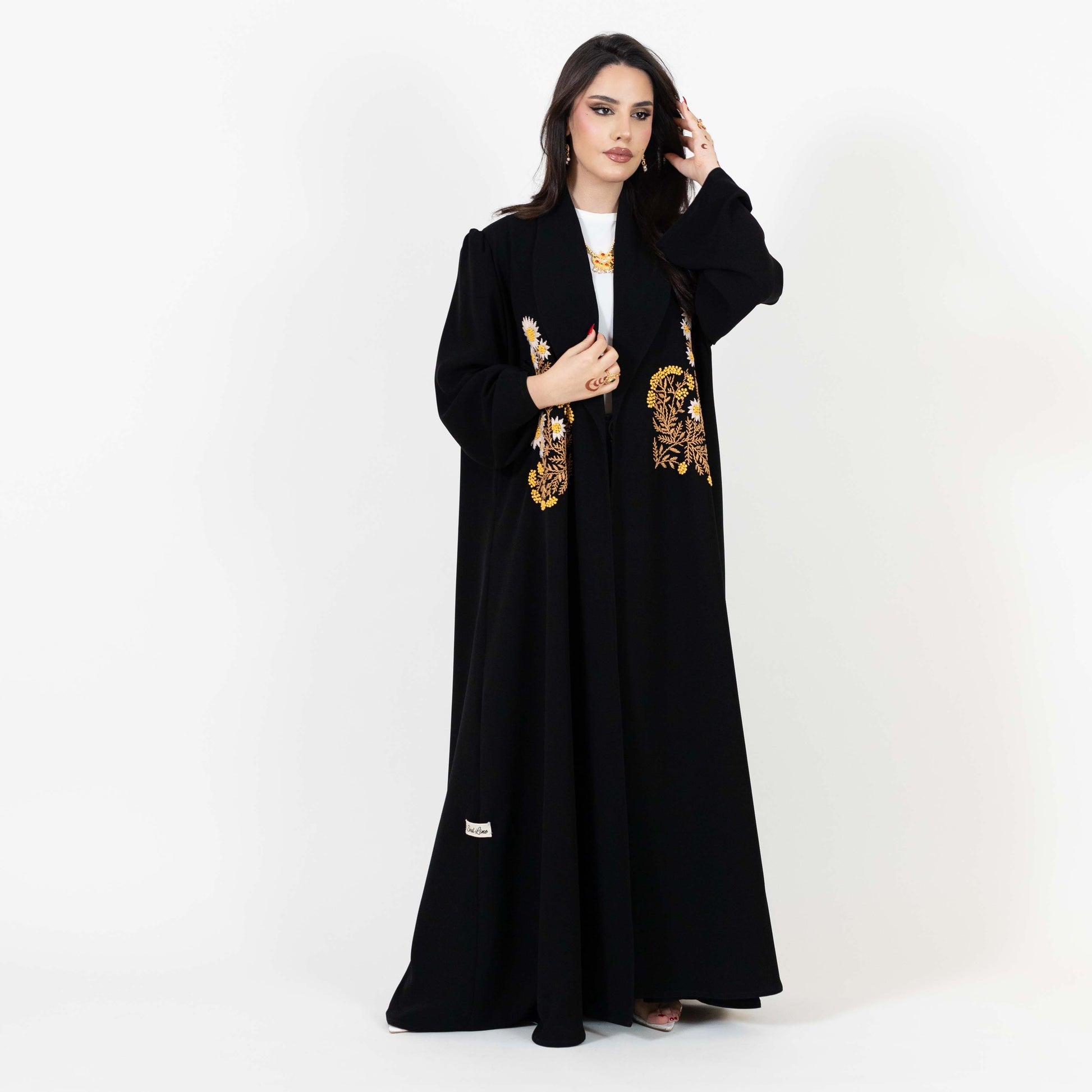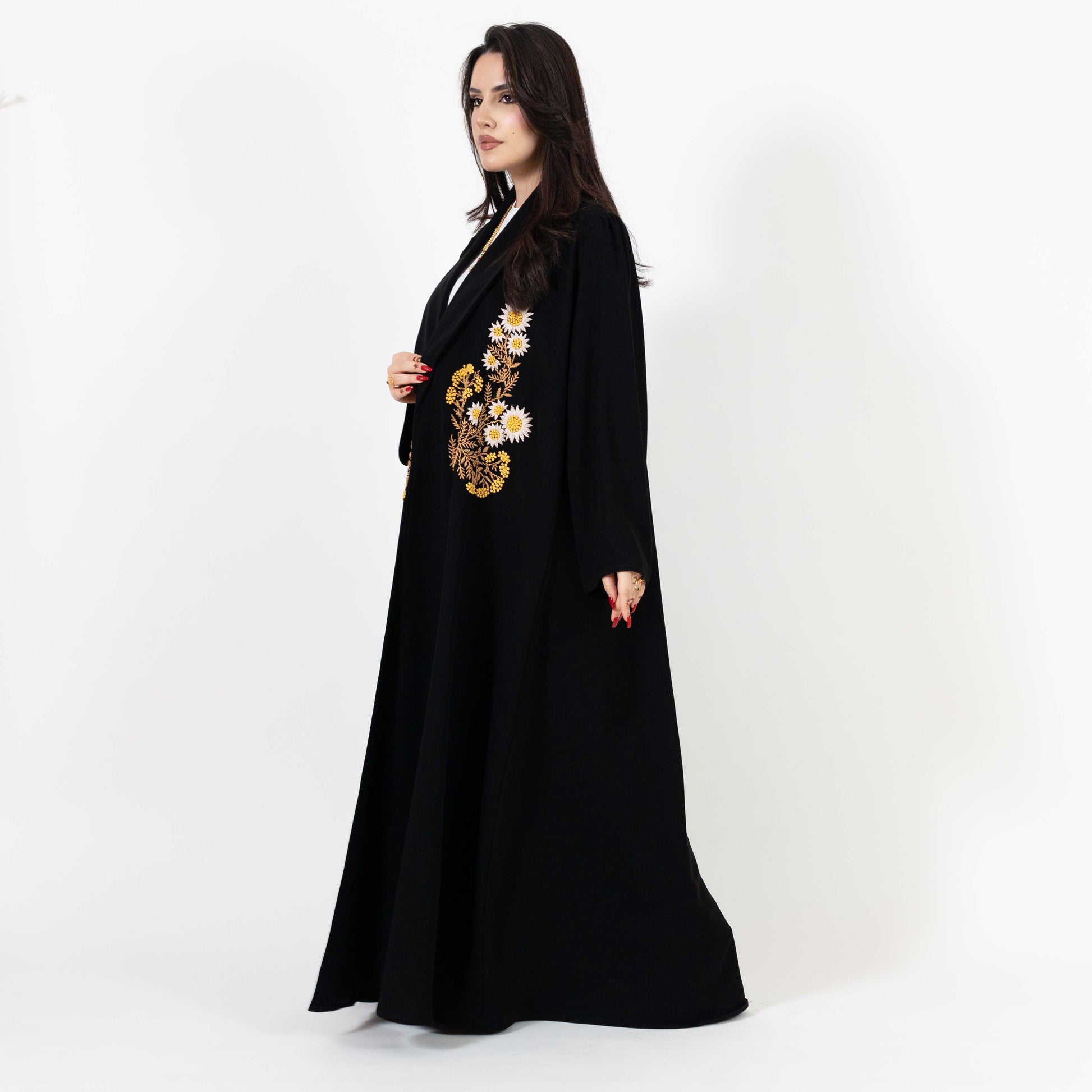 A striking black garment that exudes a sense of timeless elegance and regal allure. Crafted with meticulous attention to detail, this abaya showcases exquisite embroidery on the front sides, specifically in the waist area, creating a captivating focal point.