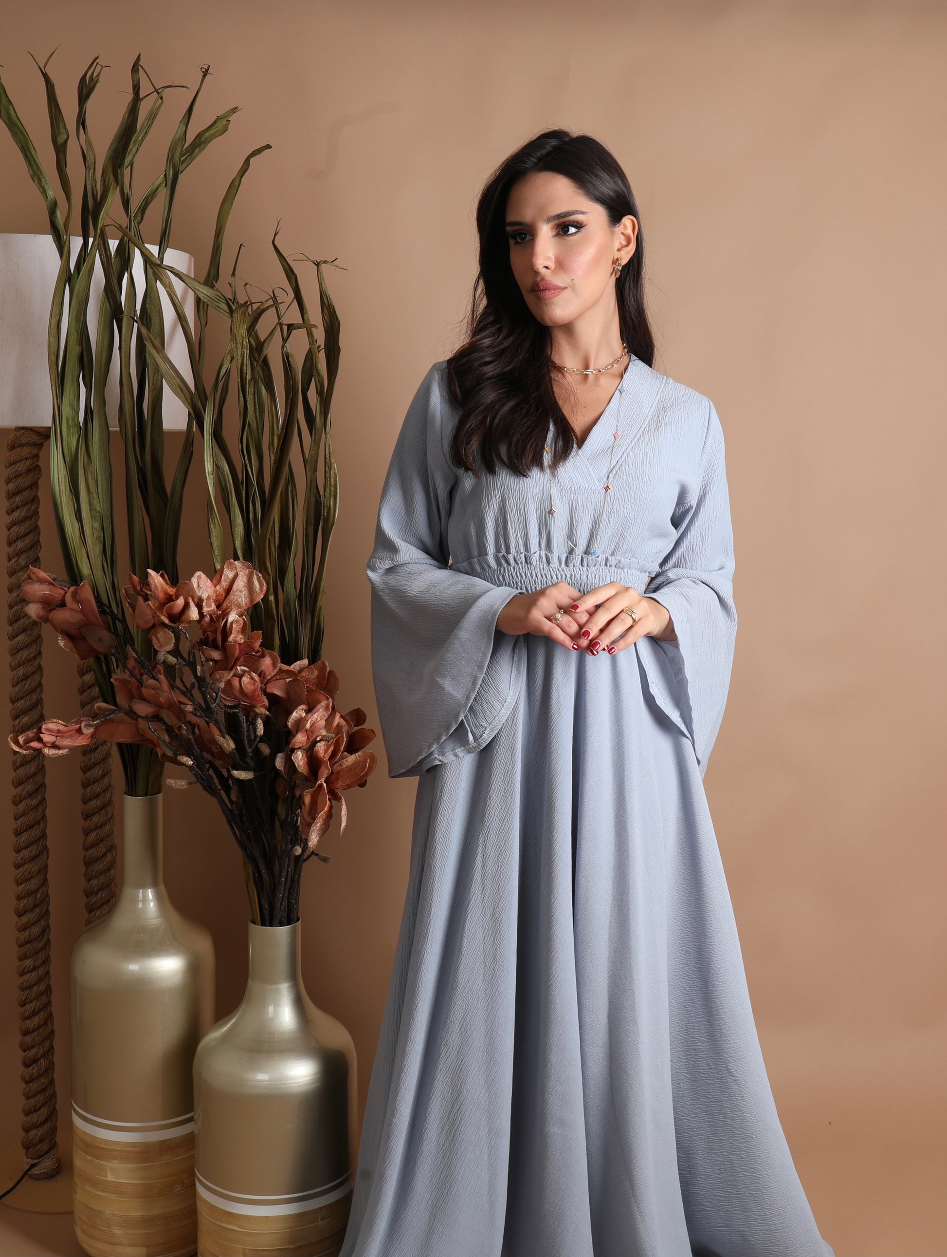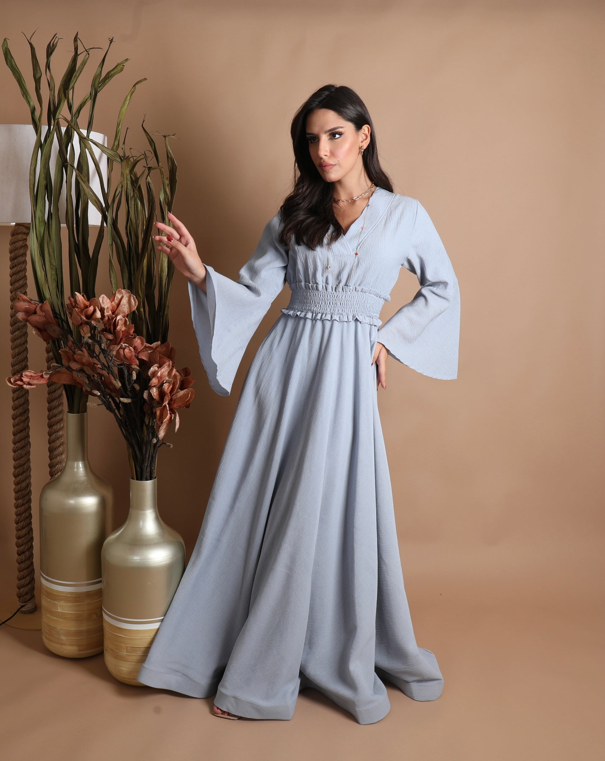 This dress features an elegant floor-length silhouette, perfectly complemented by its wide sleeves, creating a captivating and dramatic look.