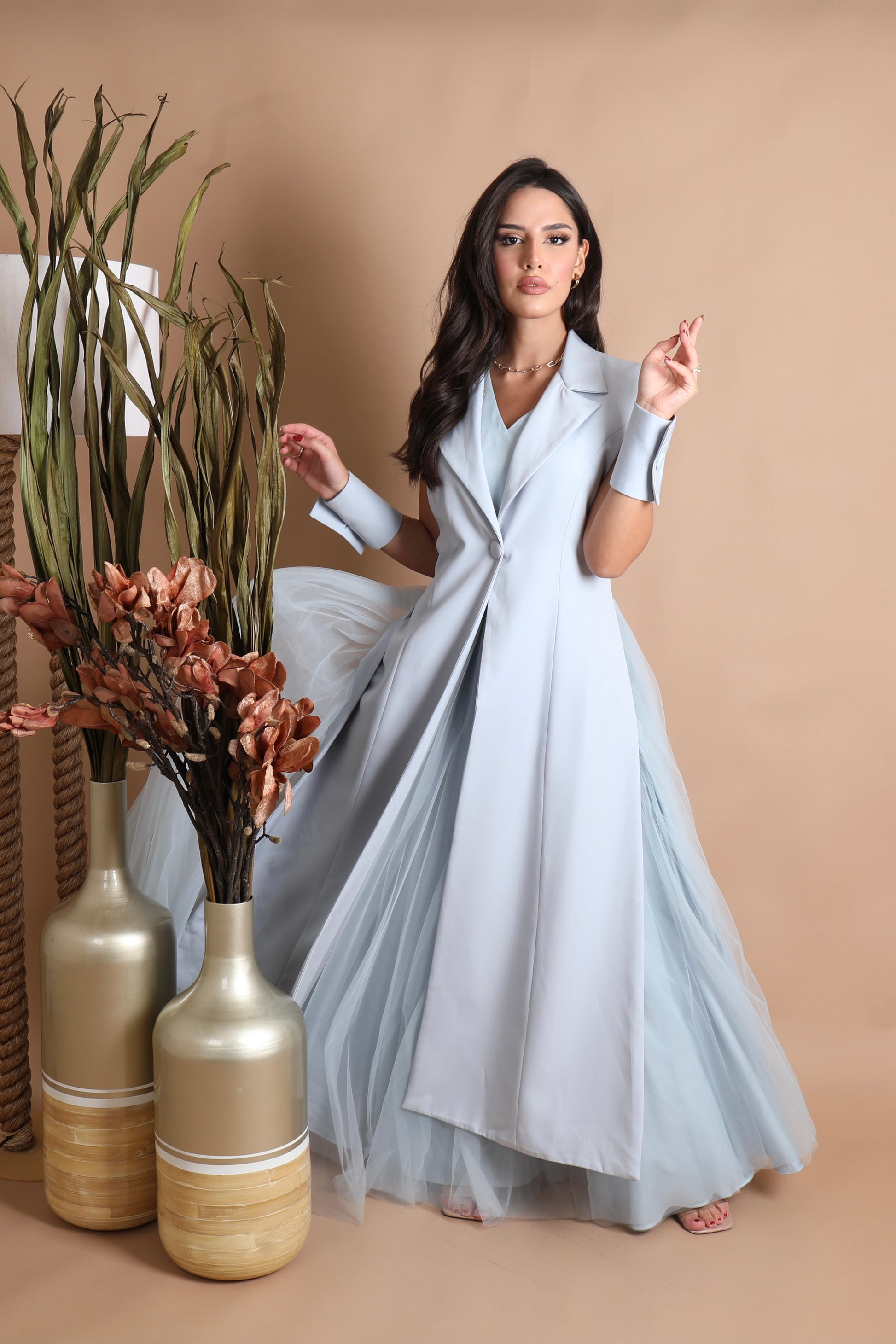 This is a chic and versatile ensemble that combines the elegance of a dress with the added flair of a jacket overlay