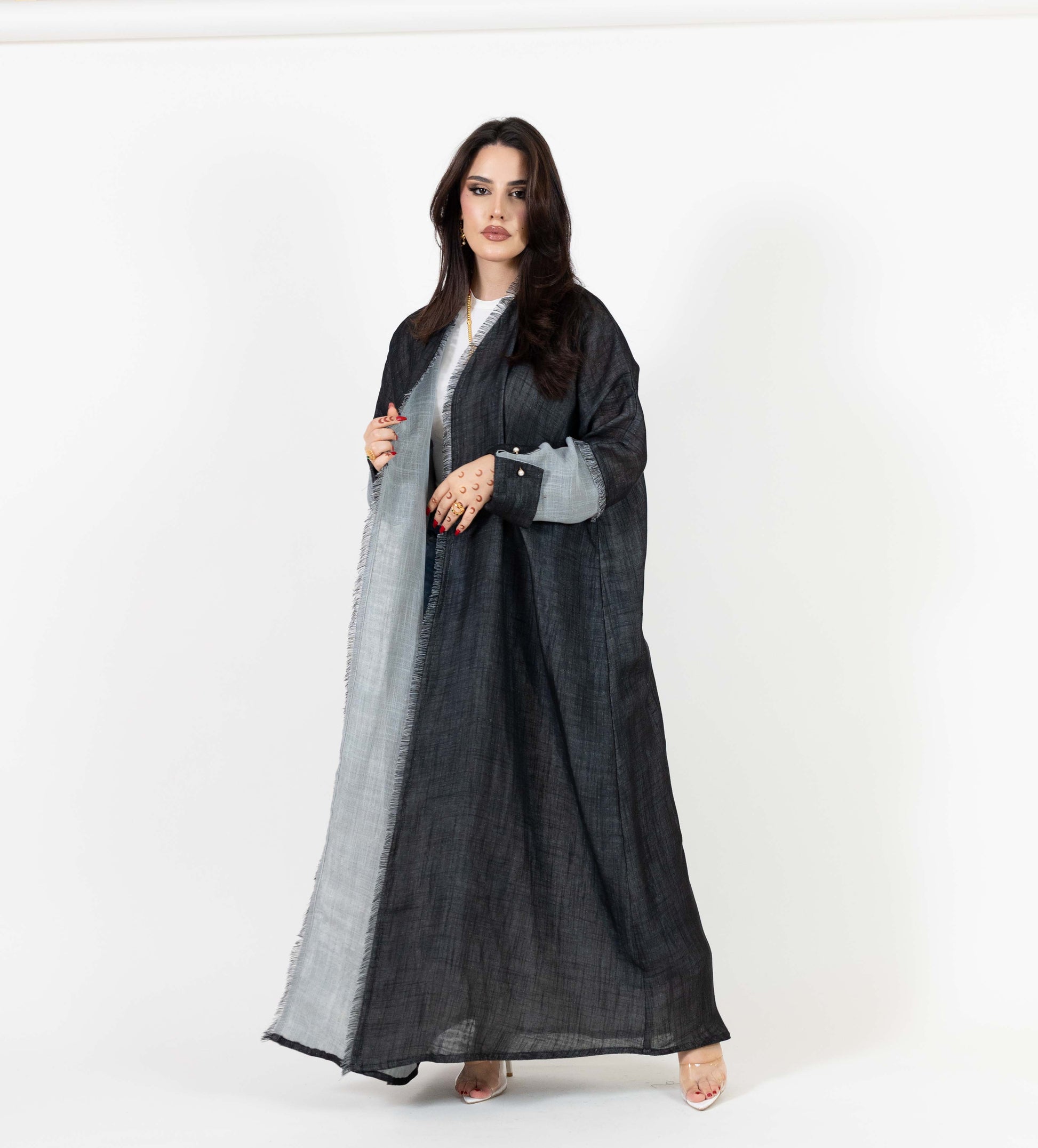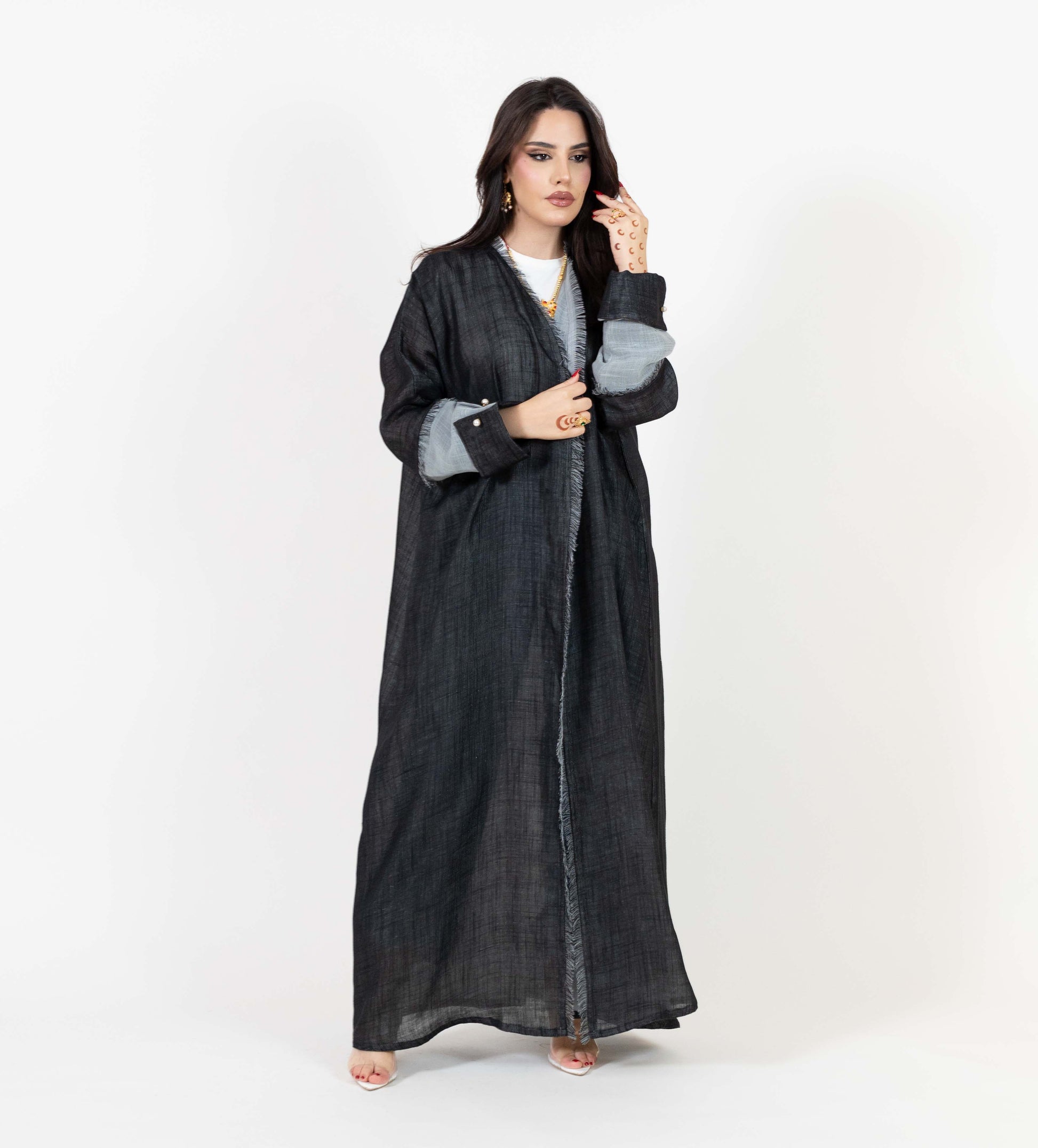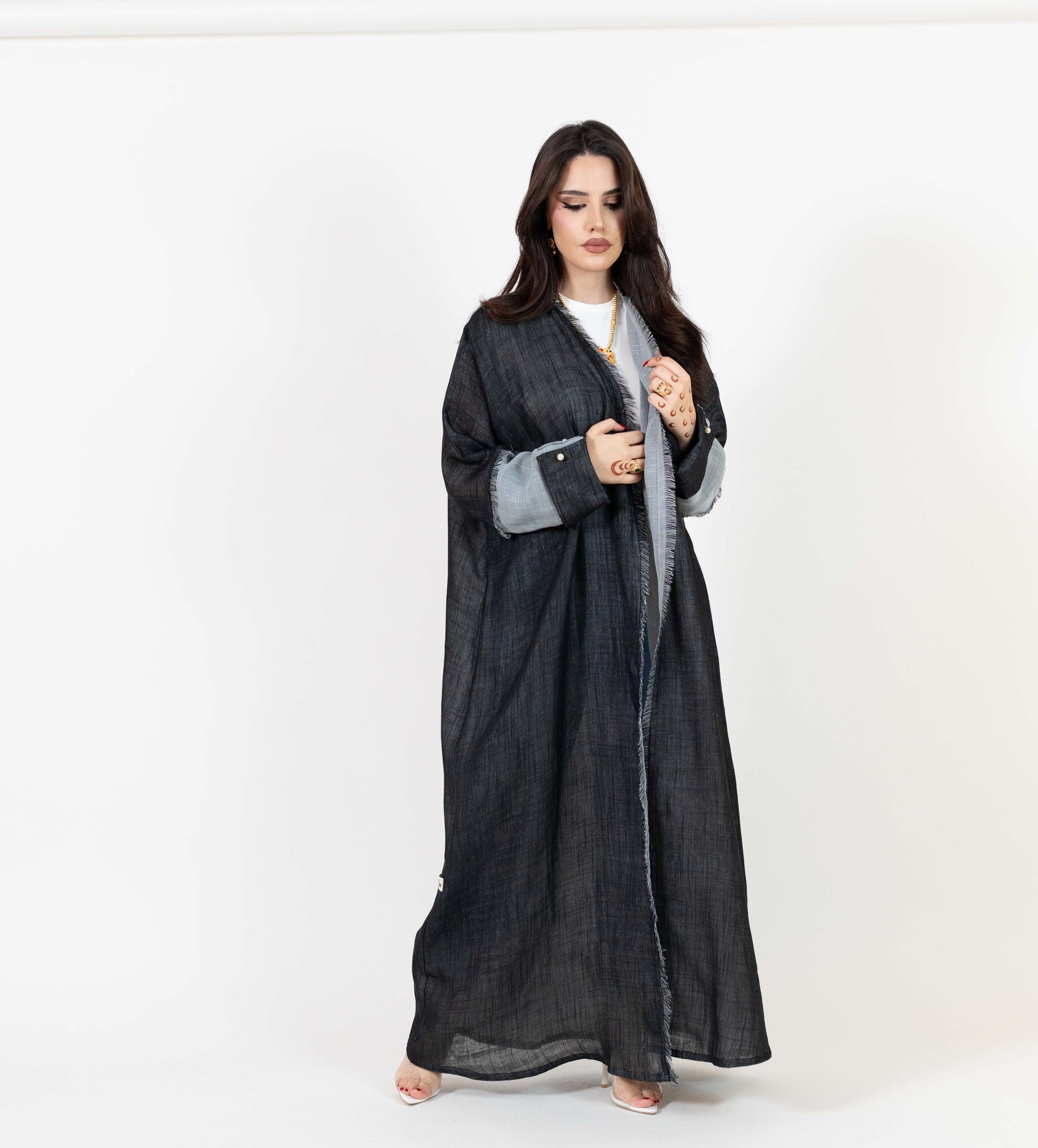 The linen abaya with detailed wrists and pearled clips is a stylish and sophisticated garment that effortlessly combines comfort and elegance. Crafted from high-quality linen fabric, this abaya offers breathability and a natural, textured look.