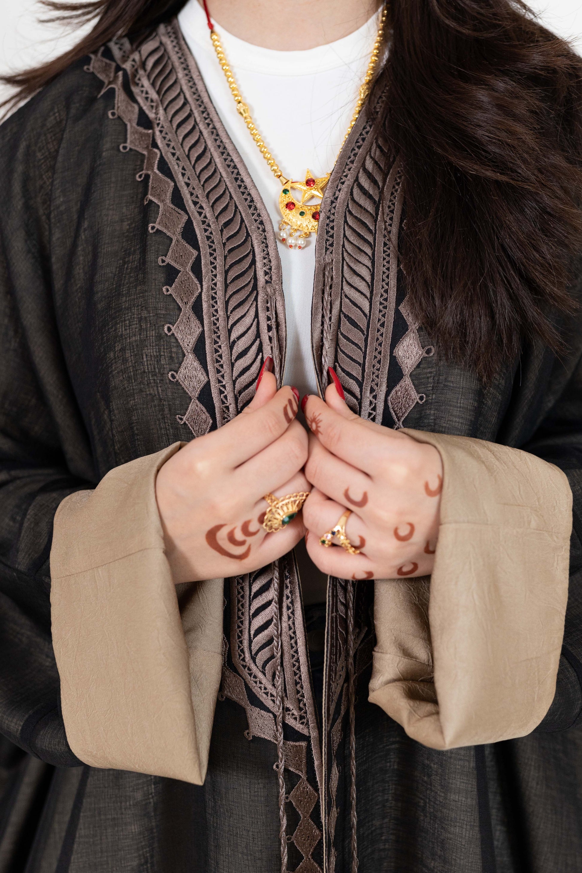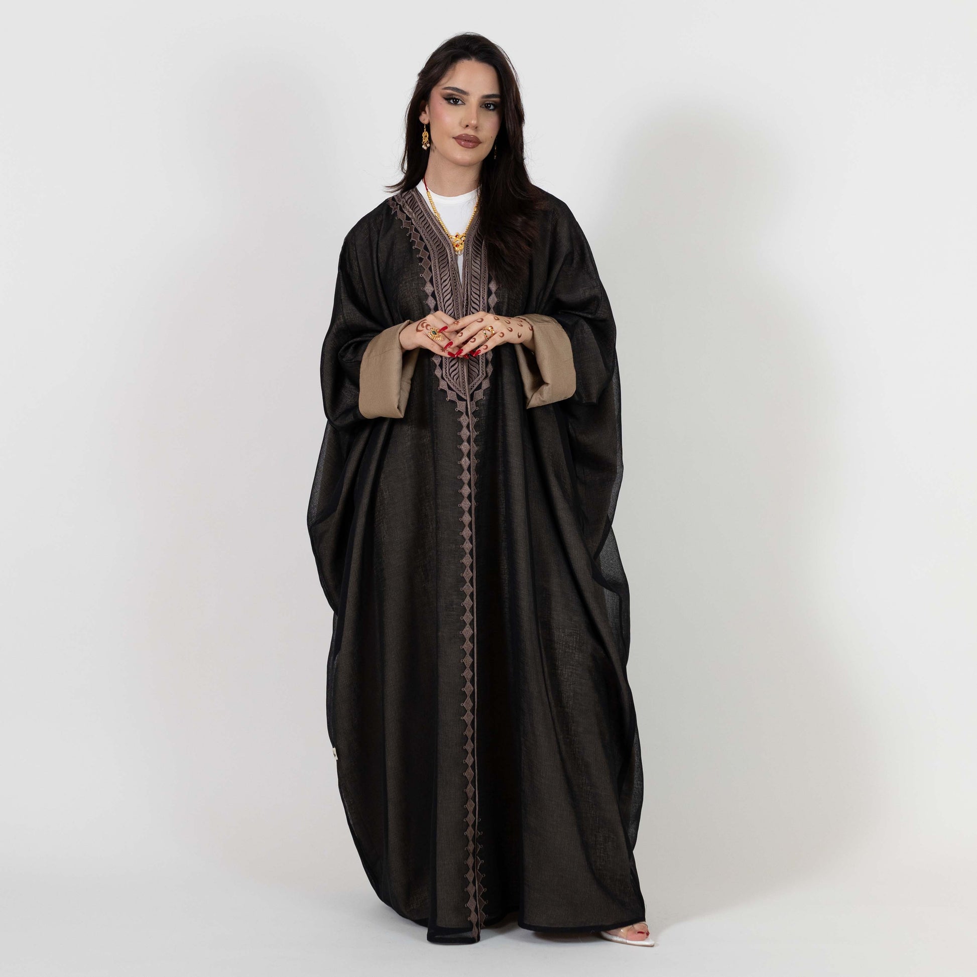 A Mesmerizing Fusion of Elegance and Intricacy. This open-front abaya is a captivating garment that combines tradition with contemporary design elements.